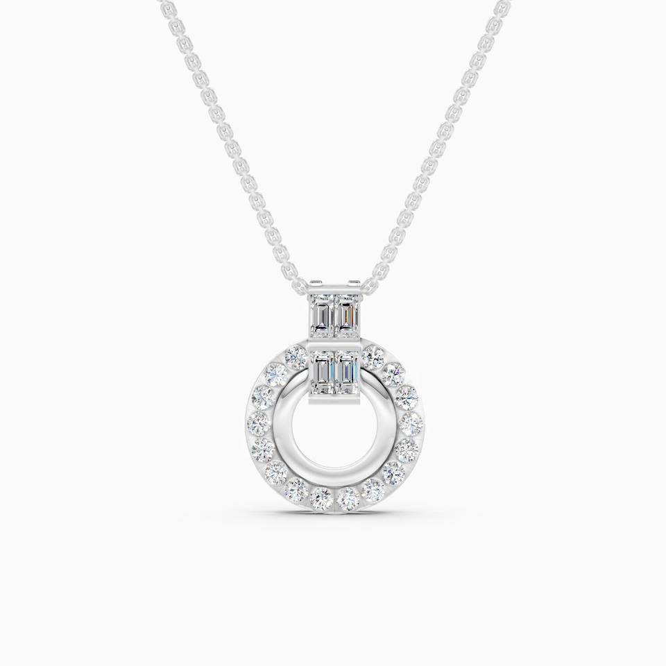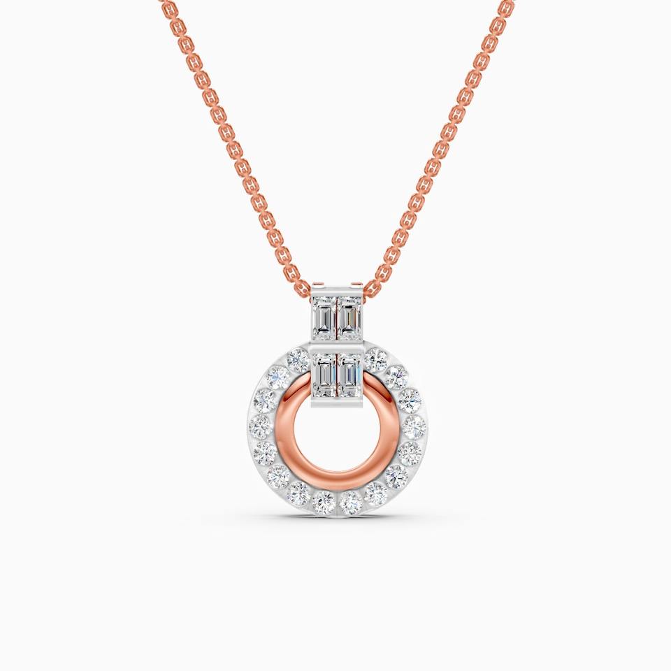 จี้เพชรทรงบาแก็ตต์ขนาด 0.49 กะรัต ประดับด้วยเพชรทรงกลมแบบฮาโล ทำจากทอง 9K สีเหลือง ขาว และโรสโกลด์