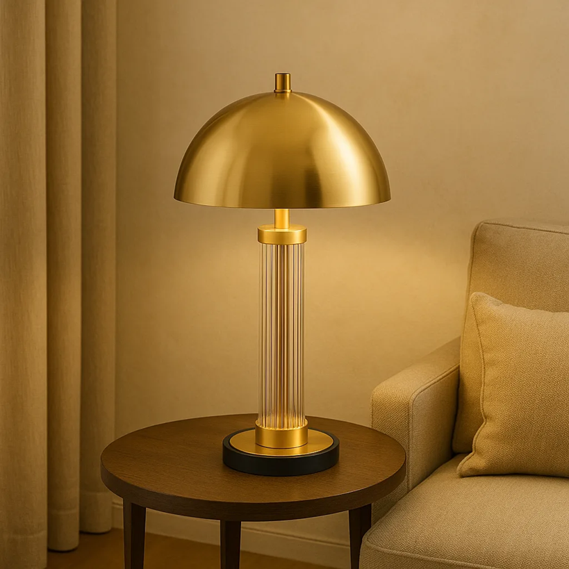 โคมไฟทองเหลืองสไตล์อาร์ตเดโคที่สวยงามโดดเด่นด้วยเสาแก้วลายร่องที่โปร่งใสและโคมทรงโดมที่ขัดเงาเรียบเนียน ในราคาขายส่ง
