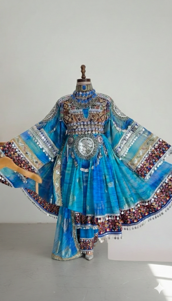 ชุดเดรสสีฟ้าอมเขียวแบบชนเผ่ากุจิของชาวอัฟกัน ดีไซน์งดงาม ประดับด้วยงานกระจกเงินอย่างละเอียดอ่อน และลูกปัดที่ประณีต พร้อมดีไซน์ขนาดใหญ่พิเศษ