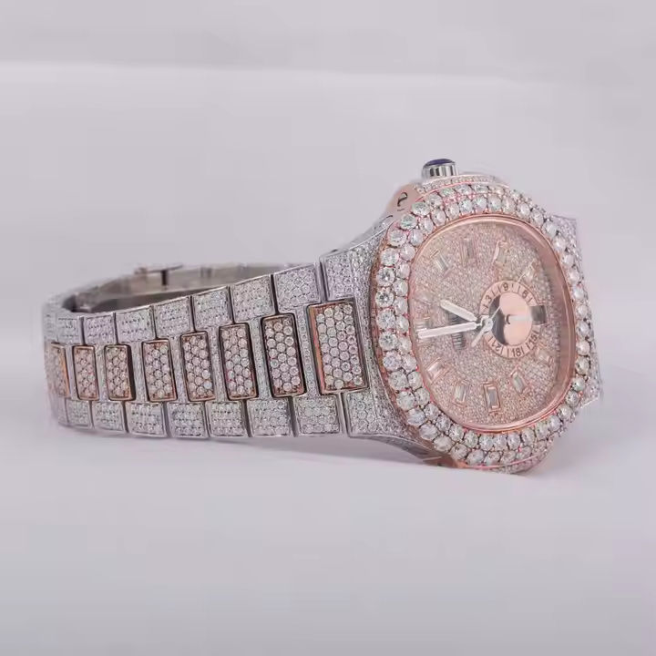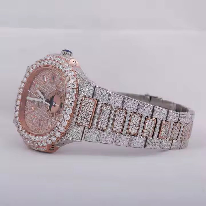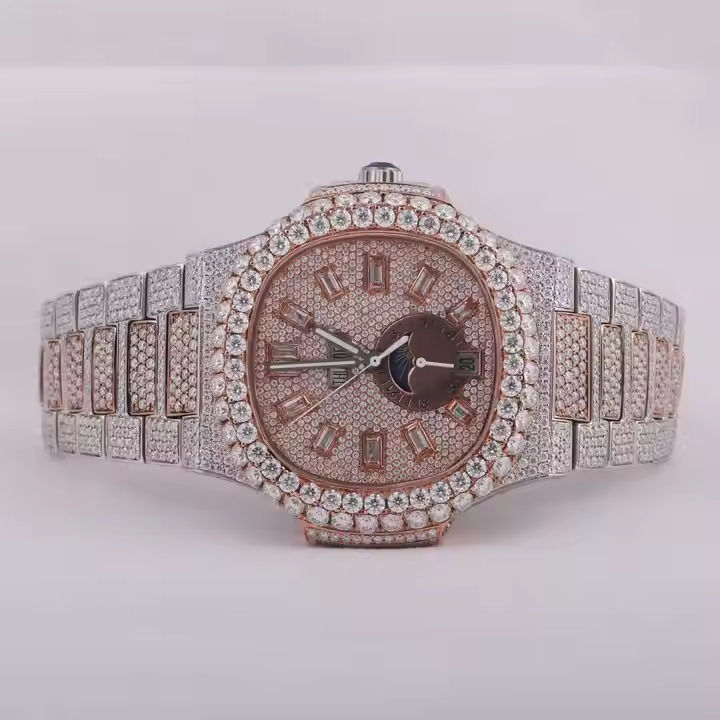 นาฬิกาเพชรโมอิสหรูหราเต็มรูปแบบหน้าปัดสีน้ำตาลที่สวยงามนาฬิกาอะนาล็อกแสดงเหล็กตัวเรือนสแตนเลส