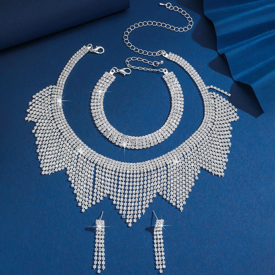 ชุดเครื่องประดับทองแดงสไตล์ยุโรปอเมริกันสุดหรู ชุบเงิน ประกอบด้วยสร้อยคอ ต่างหู และกำไลข้อมือ สำหรับเป็นเครื่องประดับงานแต่งงานสำหรับผู้หญิง