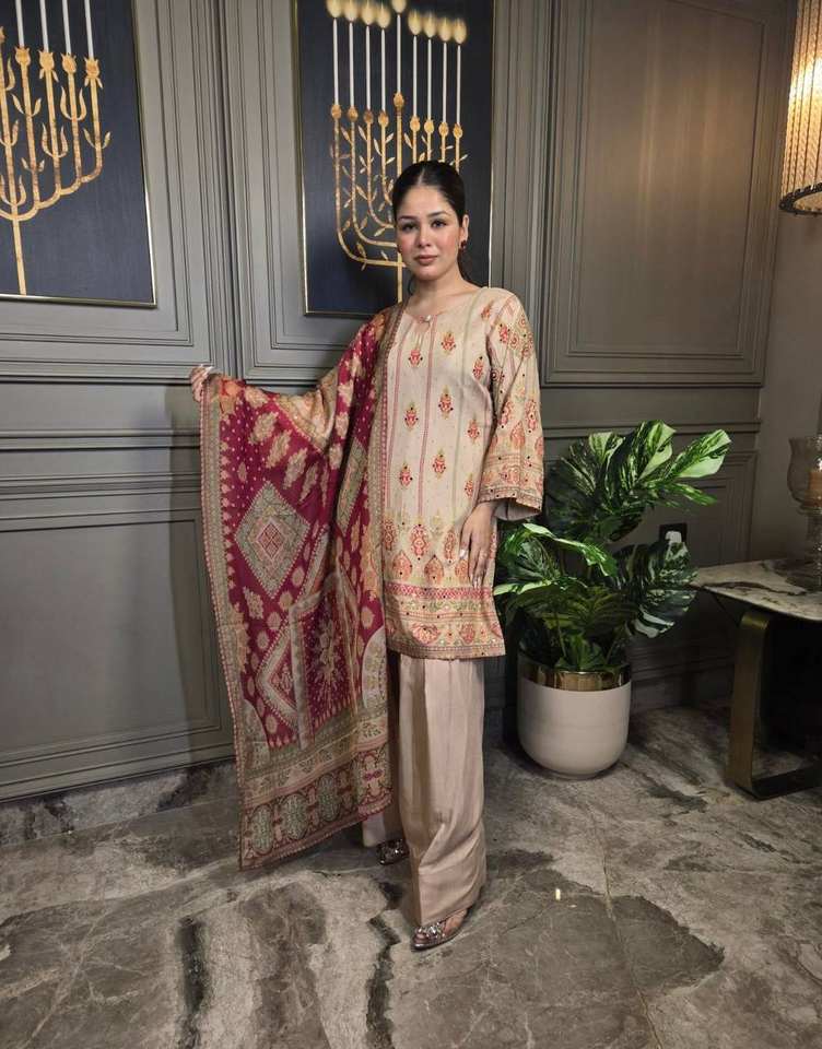 ชุดสูทพิมพ์ลายดิจิทัลสุดหรู 3 ชิ้น ประดับด้วยงานกระจกทำมือจากผ้าเครปธรรมชาติ ดีไซน์สวยงาม ชุดคุर्ติพร้อมกางเกง