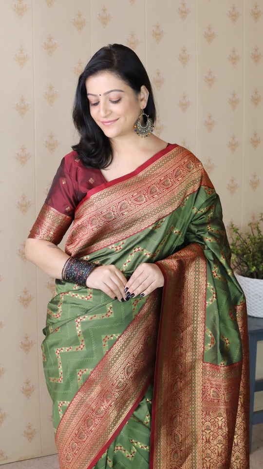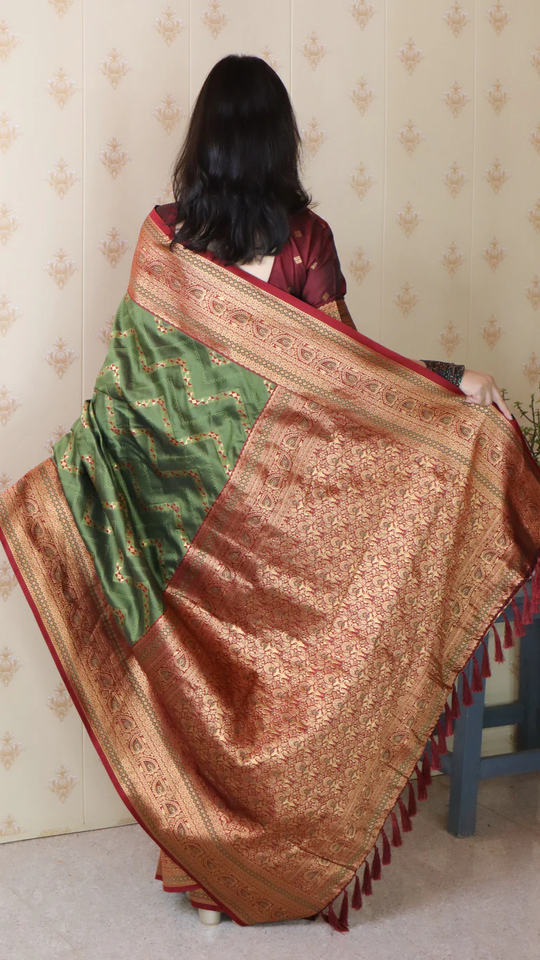 สีเขียวที่สวยงามด้วยผ้าไหมสีแดงเข้มนุ่มส่าหรีที่มีการทอผ้าแบบซิกแซก Meenakari zari ที่สมบูรณ์แบบสำหรับงานแต่งงาน