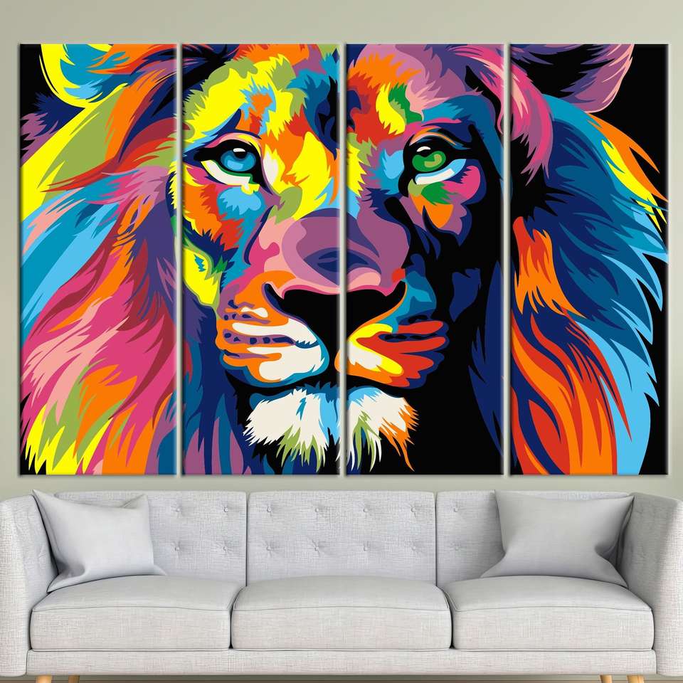 ภาพพิมพ์บนผ้าใบลายสิงโตอันน่าทึ่ง: ศิลปะติดผนังแบบนามธรรม สีสันสดใส ทันสมัย 4P: ห่อหุ้มอย่างดี