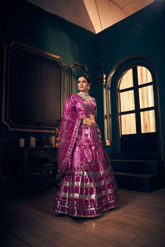 ชุดเลเฮนกาโชลีสีม่วงแดงสุดหรู พร้อมงานปักกระจกแบบดั้งเดิม ชุดเจ้าสาวอินเดียสำหรับขายส่งออก
