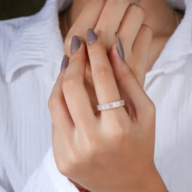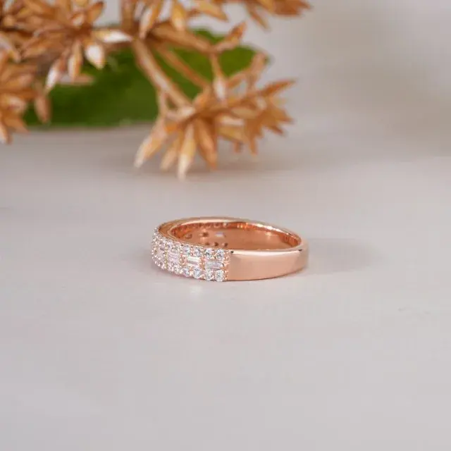แหวนแต่งงานทรงอิเทอร์นิตี้ประดับมอสซาไนต์สามแถวสีโรสโกลด์สุดหรู ดีไซน์ทรงบาแกตต์และทรงกลม เหมาะเป็นของขวัญวันครบรอบสำหรับเธอ