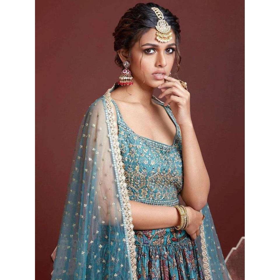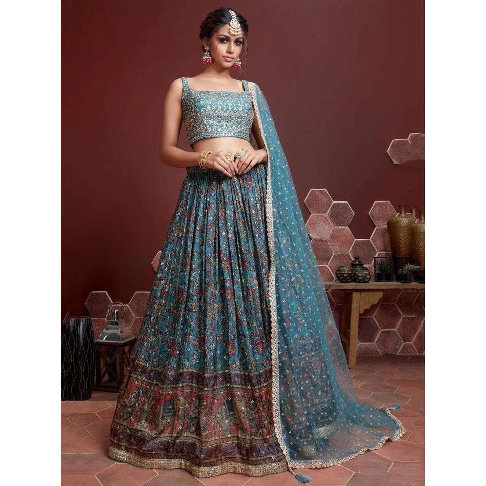Lehenga choli ชุดต้อนรับผ้าไหมลายท้องฟ้าสีฟ้าที่น่าทึ่ง