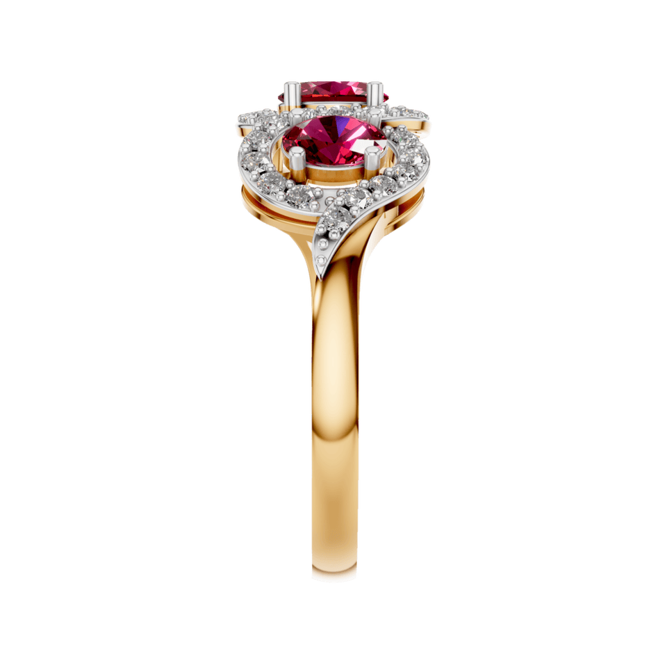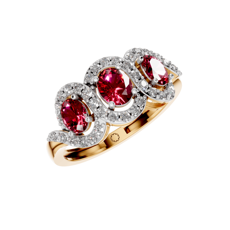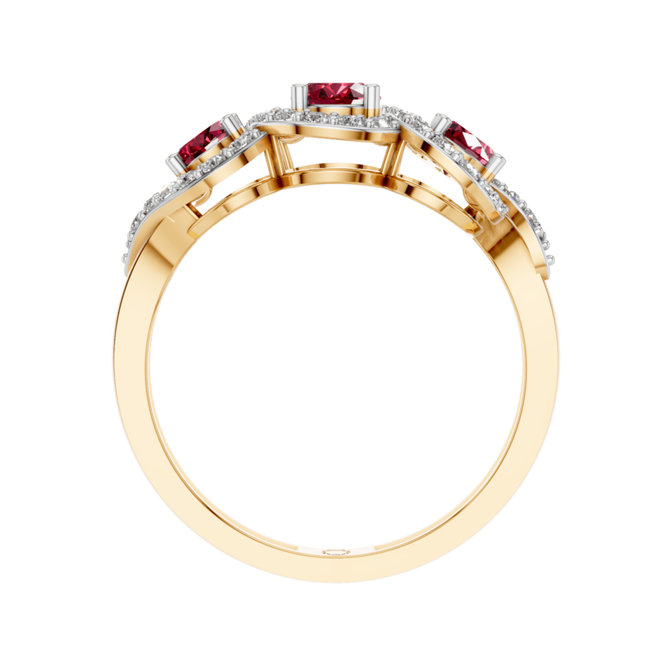 Style:Three-Stone Red Ruby Ring with Diamond Halo