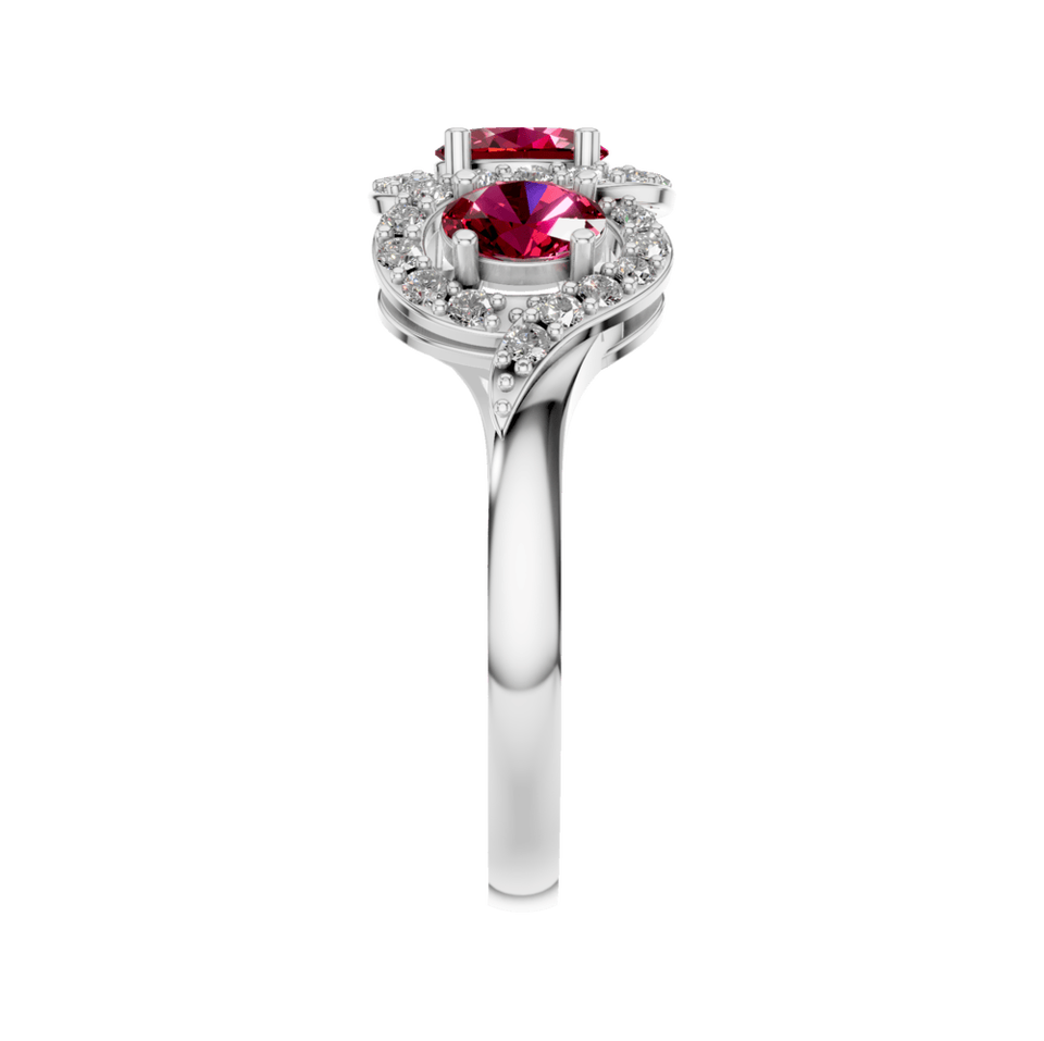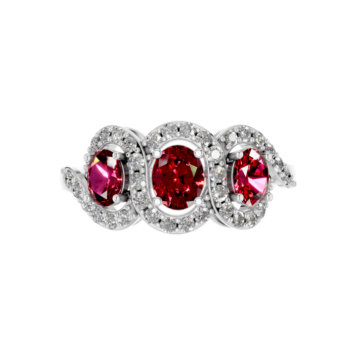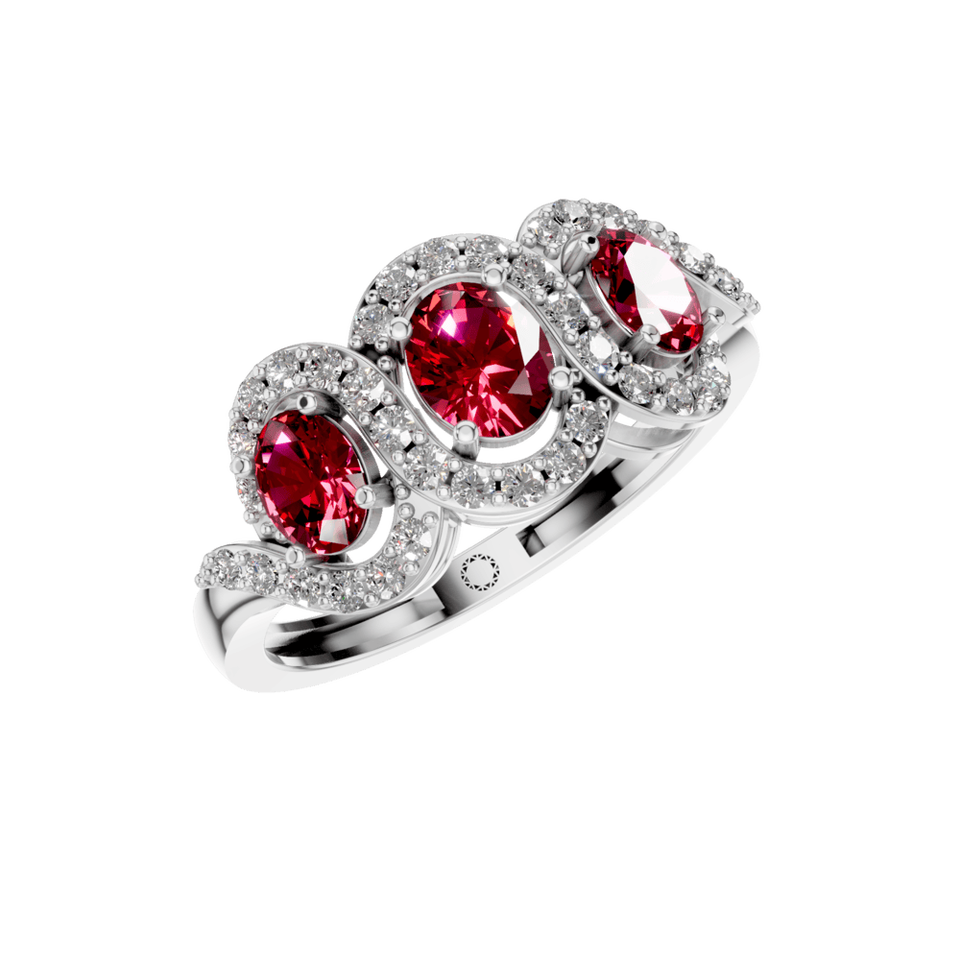 แหวนทับทิมแดงสามเม็ดพร้อมเพชรฮาโล