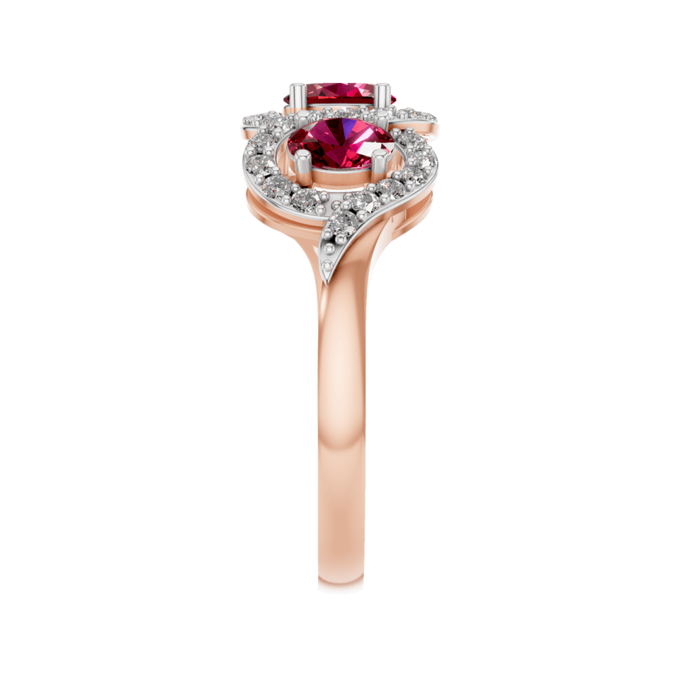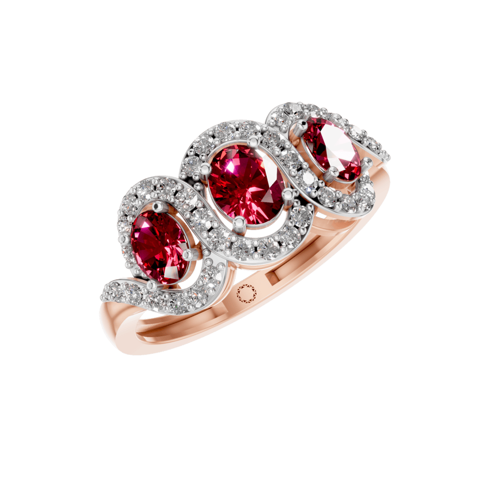 Style:Three-Stone Red Ruby Ring with Diamond Halo