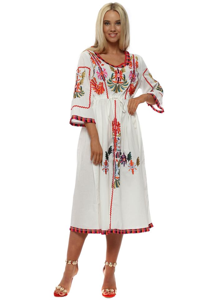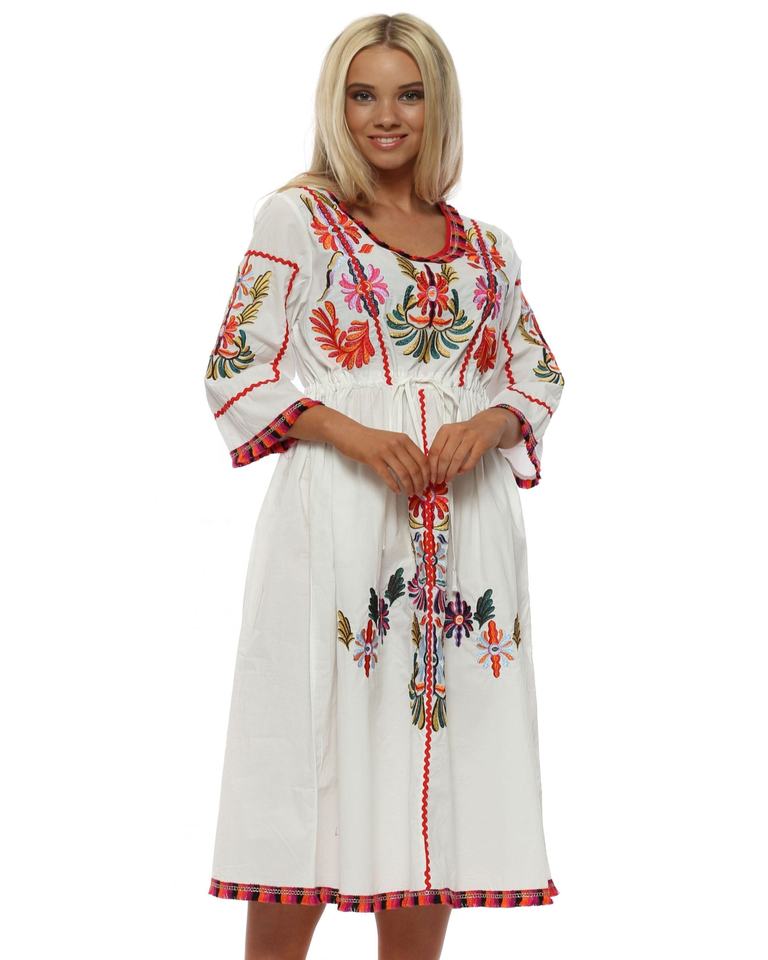 ชุด Midi ผ้าฝ้ายสีขาวที่น่าทึ่งสำหรับเด็กผู้หญิงชุดสไตล์ยิปซีแขนสี่ส่วนสวยปักลายโบโฮสำหรับเด็ก