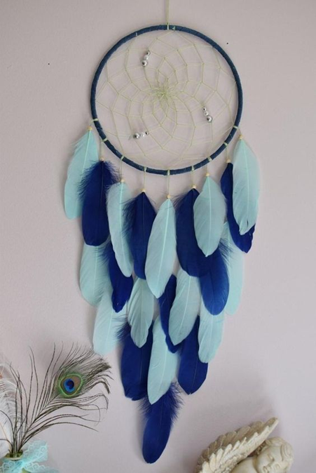 เครื่องดักฝันขนนกสีน้ำเงินเข้มที่สวยงามและขนนกน้ำสีฟ้าสดใสศิลปะผนังทำด้วยมือมีจำหน่ายในราคาขายส่ง