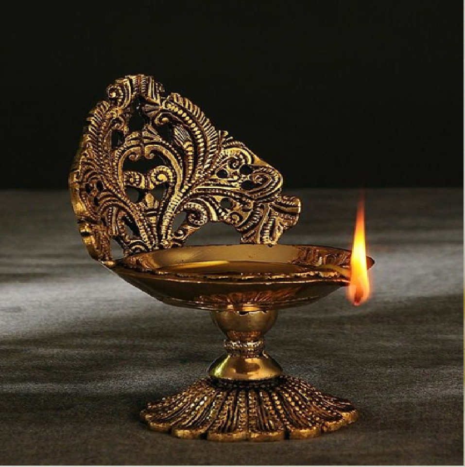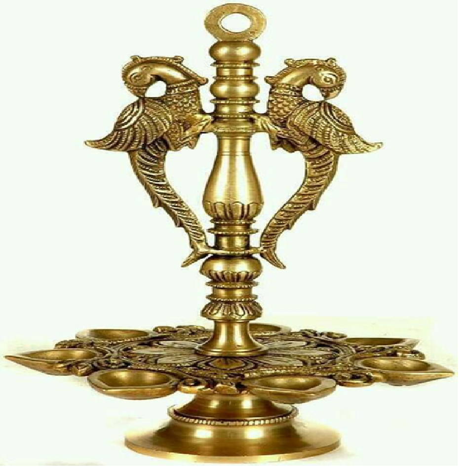 ตะเกียงรูปนกยูงสวยงาม พร้อมไส้ตะเกียงห้าอัน ประดับบนฐานขาตั้งสามขาสำหรับพิธีบูชา มีจำหน่ายในราคาขายส่ง