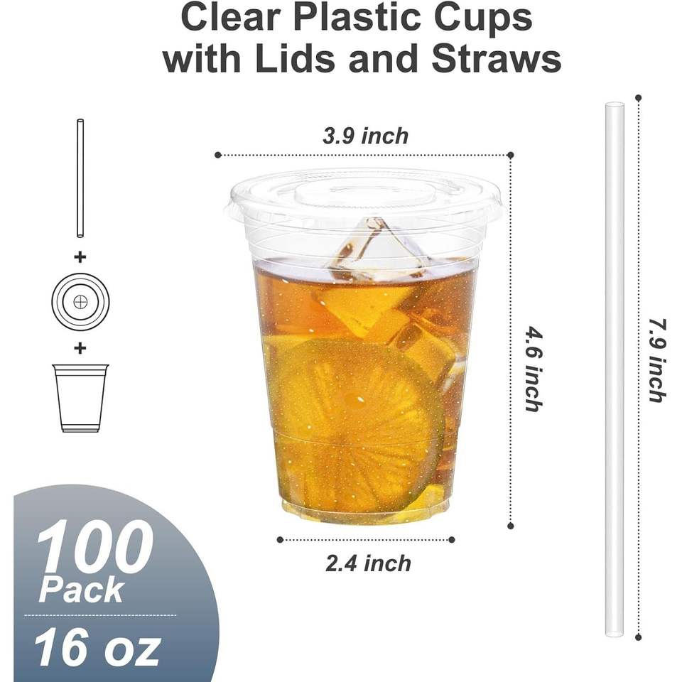 แก้วพลาสติกใสแบบใช้แล้วทิ้ง 100 ชิ้น พร้อมฝาและหลอดดูด สำหรับกาแฟเย็นและสมูทตี้ แข็งแรง ปลอดภัยสำหรับอาหาร