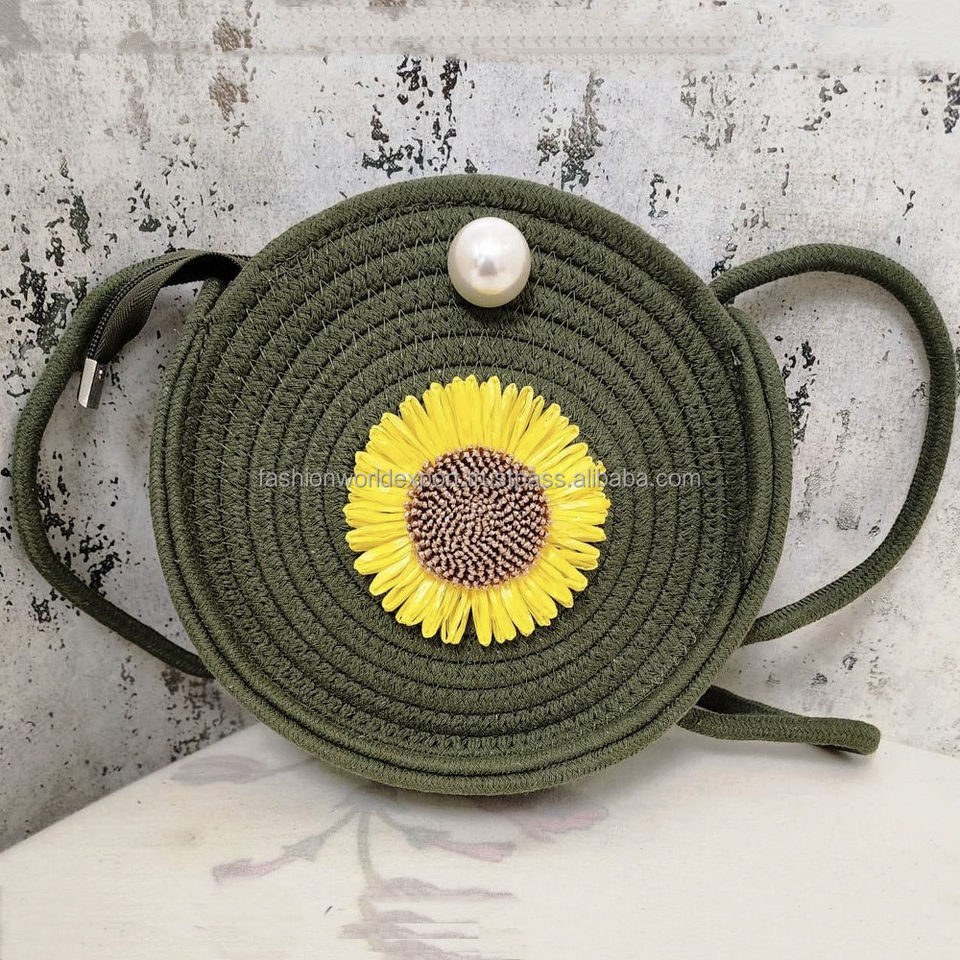 กระเป๋าทรงกลมสีฟ้าน้ำทะเลมีสไตล์พร้อมกระเป๋าคาดลำตัวทำจากผ้าฝ้ายทำด้วยมือประดับดอกทานตะวันพร้อมฝาปิดไข่มุกเทียม