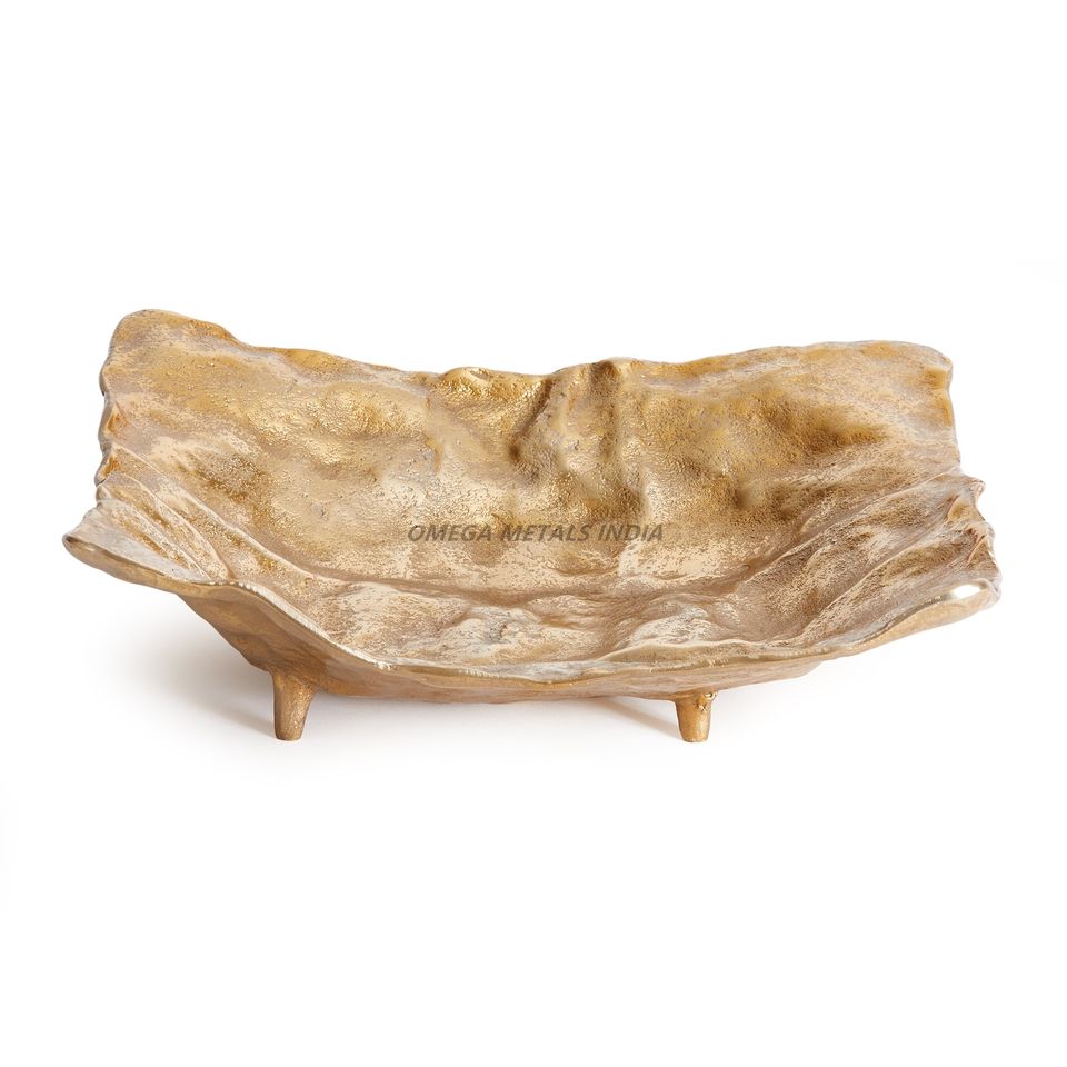 ถาดเสิร์ฟเนื้อสีทองมีสไตล์ที่มีรูปทรงเป็นเอกลักษณ์และขาที่สง่างามสำหรับการจัดแสดงที่ตกแต่งอย่างหรูหราในงานพบปะสังสรรค์