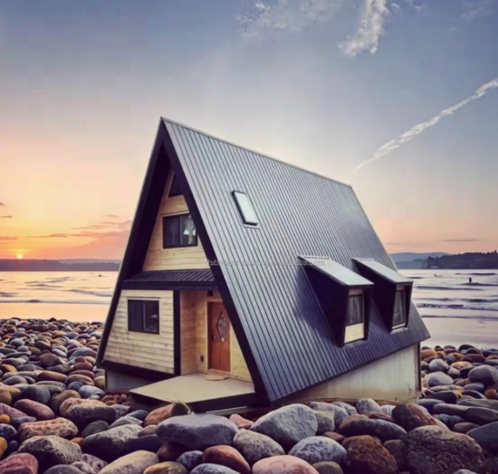 บ้านขนาดเล็กในเมือง A-Frame ช่วยประหยัดพลังงานสีดำมีสไตล์วิลล่าเป็นเหล็กในห้องนั่งเล่นห้องนอนห้องครัวสีเขียว