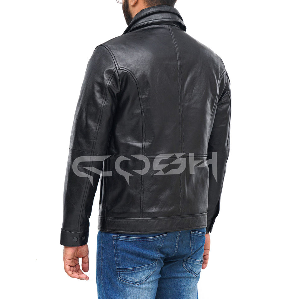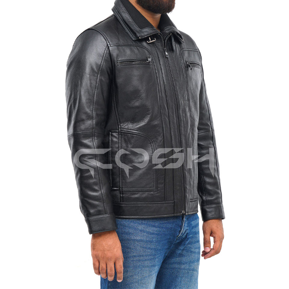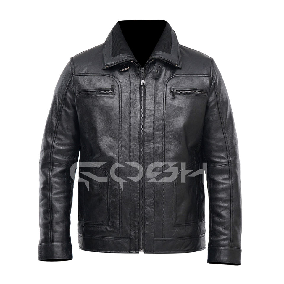 แจ็คเก็ตหนังสีดำสุดเท่ ดีไซน์ซิปด้านหน้า พร้อมกระเป๋าอเนกประสงค์หลายช่องและคอเสื้อแบบมีปก