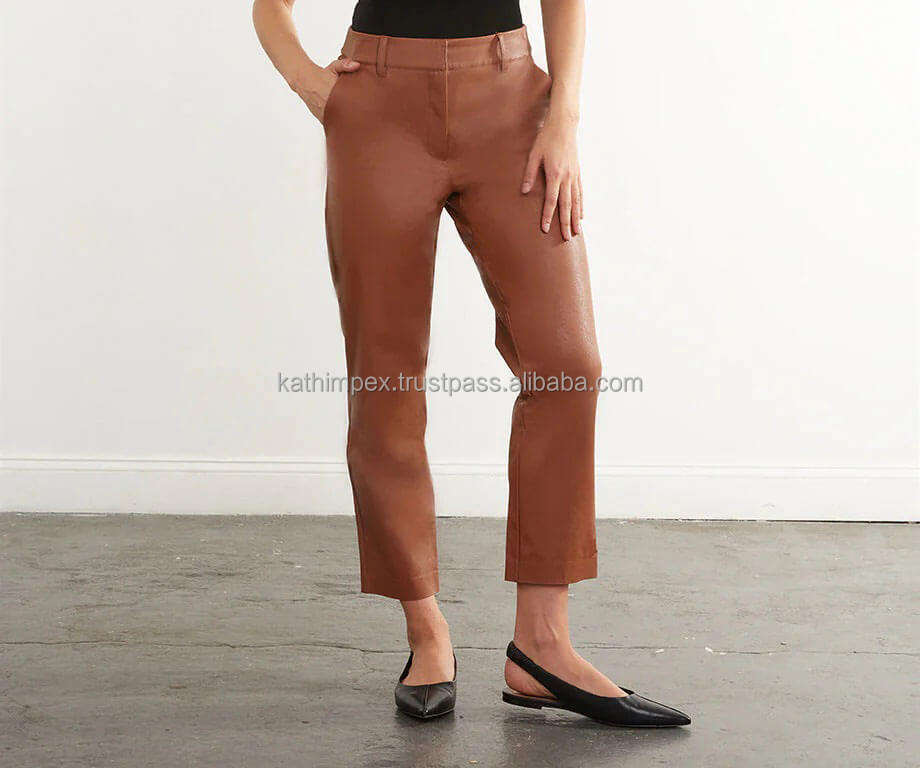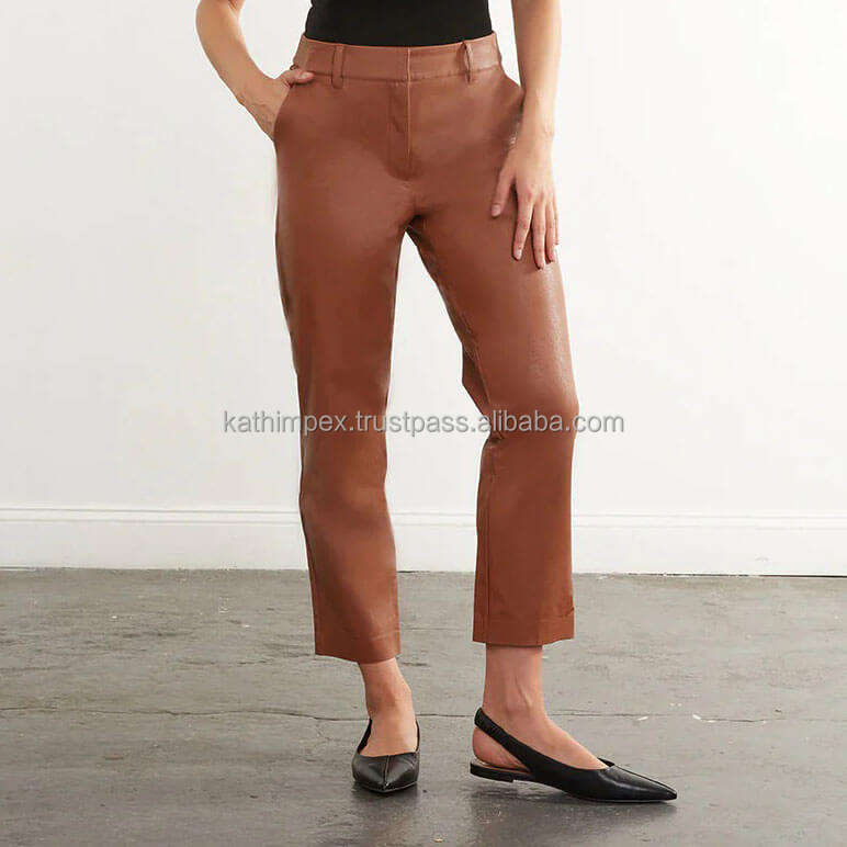 กางเกงหุ้มข้อหนังเทียมสีน้ำตาลมีสไตล์สำหรับผู้หญิงเอวสูงเข้ารูปขาเรียวระบายอากาศด้านหน้าแบนสำหรับใส่ทำงานลำลอง