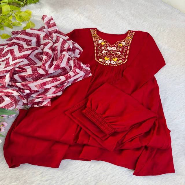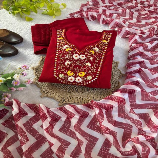 ชุดผ้าไหมและกางเกงมัสลินสีแดงเชอร์รี่มีสไตล์ประกอบด้วย2.2 MTR taby Silk dupatta พร้อมขอบกล่องลายกล่อง