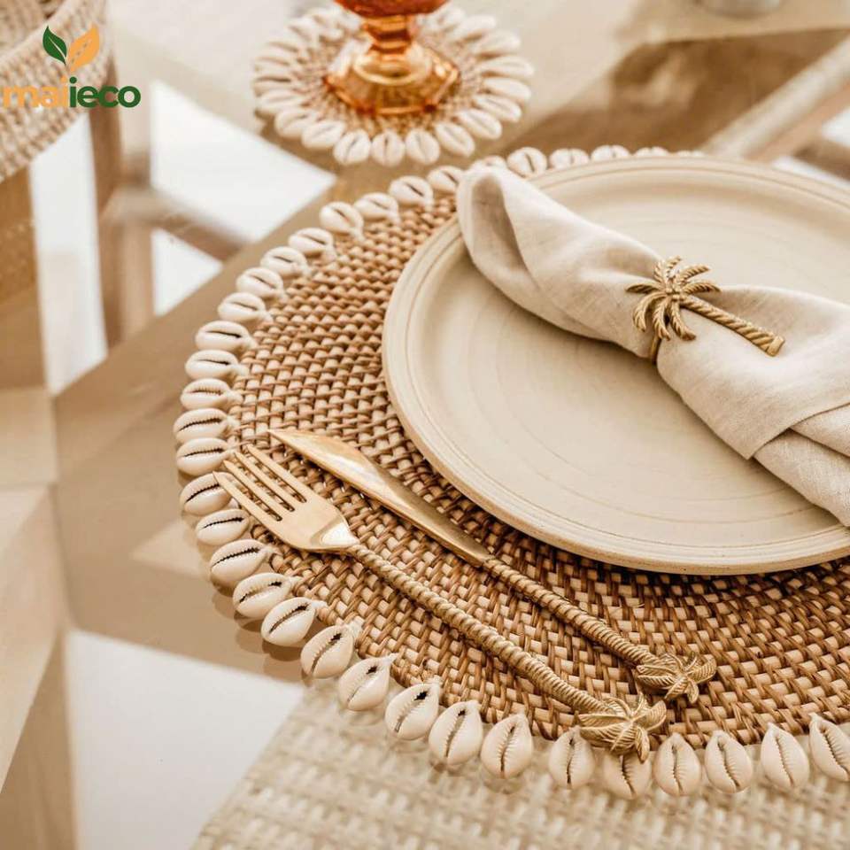 แผ่นรองจานหวายสไตล์คลาสสิก สวยงาม เป็นมิตรกับสิ่งแวดล้อม ผลิตด้วยมือ ทำความสะอาดง่าย ดีไซน์เปลือกหอย ส่งออกจากเวียดนาม