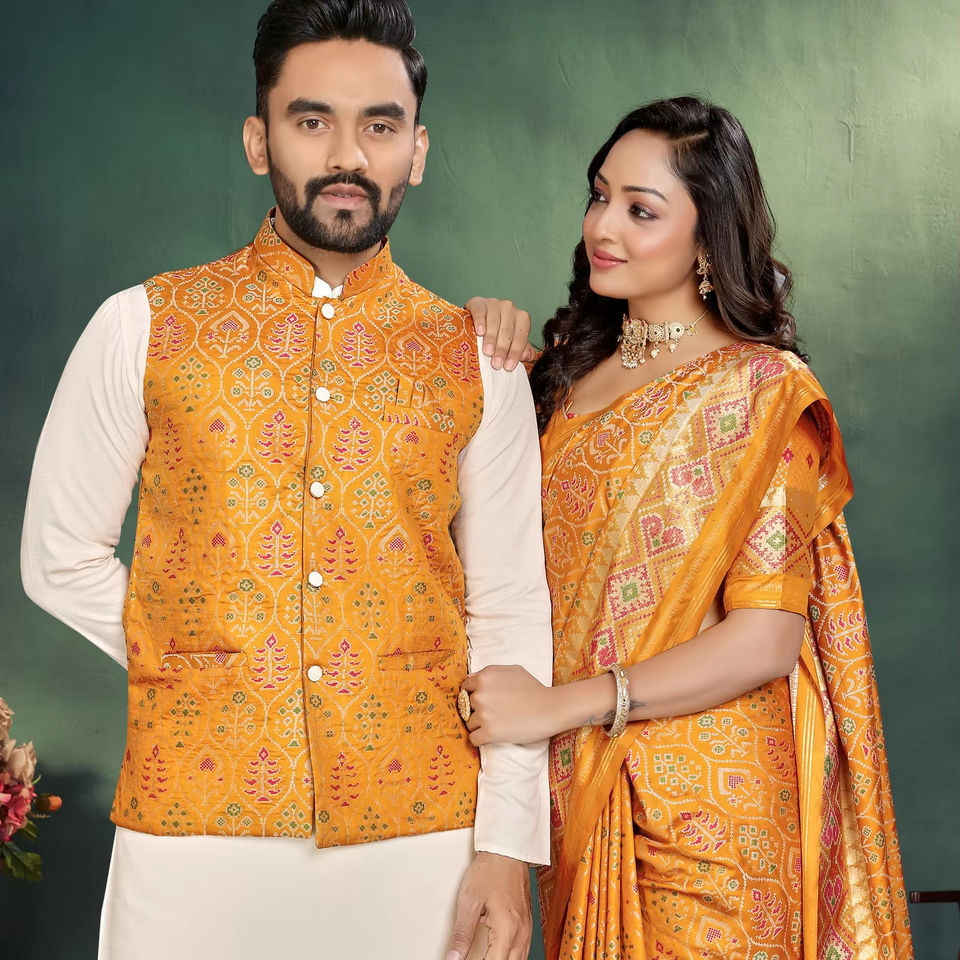 Stylish Couple Matching Kurta Koti and Saree Set in Jacquard Weaving Silk and Cotton Fabric for Festive Traditional Wear