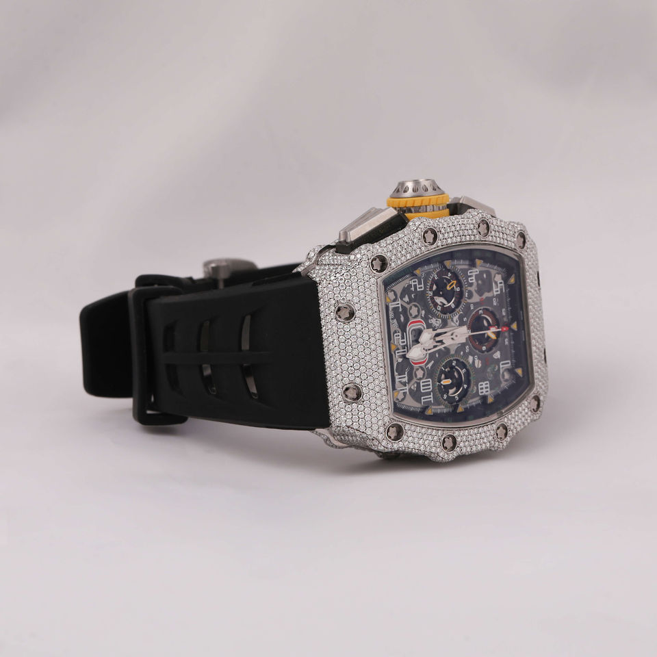 นาฬิกาเพชรแบบฮิปฮอปเท่ออกแบบได้ตามต้องการสำหรับผู้ชายใสไม่เป็นสนิมเครื่องประดับยางนาฬิกาอะนาล็อก
