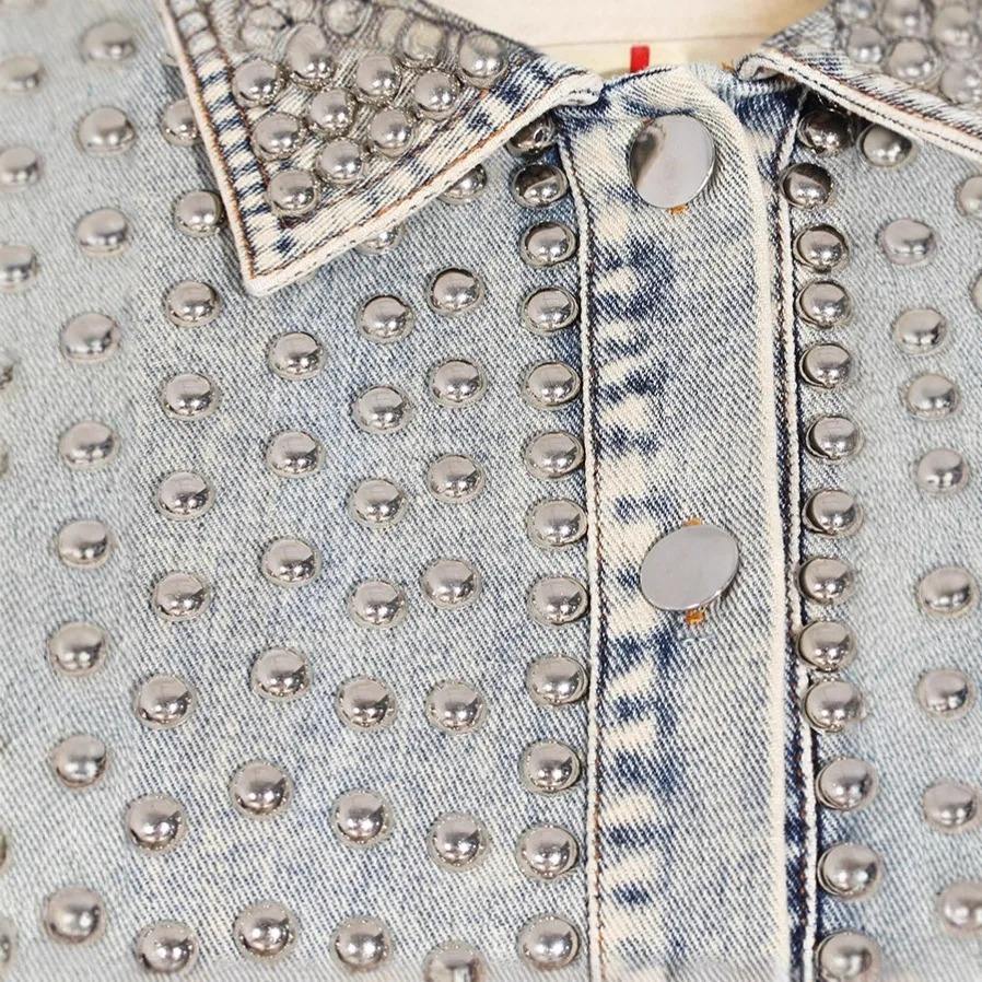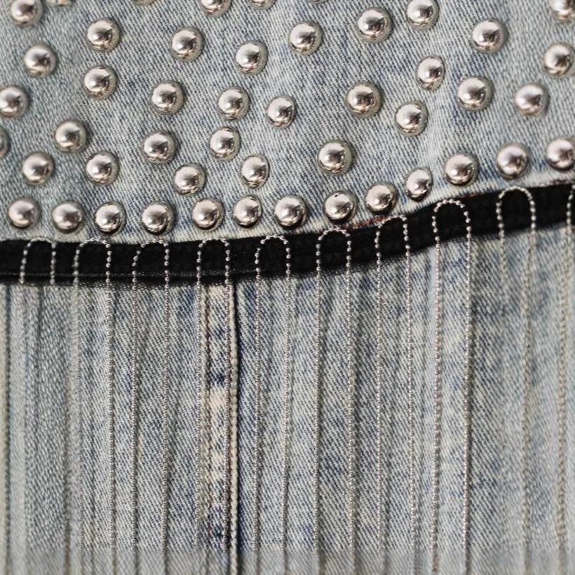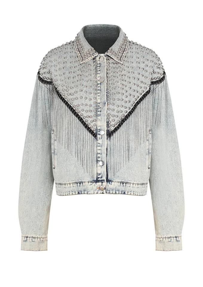 แจ็กเก็ตยีนส์มีสไตล์สำหรับผู้หญิง, แจ็กเก็ตแต่งเป็นฝอยกระดุมโลหะและเสื้อยีนส์ทรงหลวมสำหรับผู้หญิงในฤดูใบไม้ร่วง