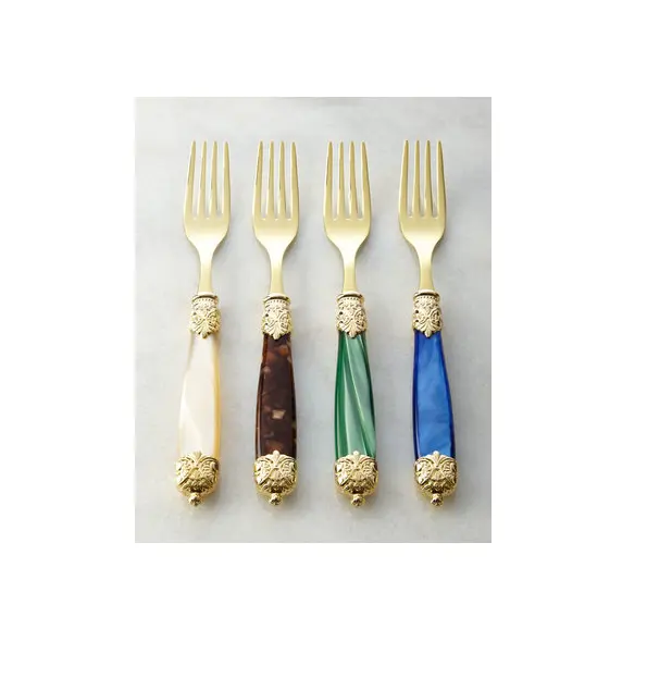 ชุดเครื่องใช้บนโต๊ะอาหารทำจากทองเหลืองมีด้ามจับเรซินสีชมพูดีไซน์ทันสมัยชุดเครื่องใช้บนโต๊ะอาหารสำหรับตัวอย่างฟรี