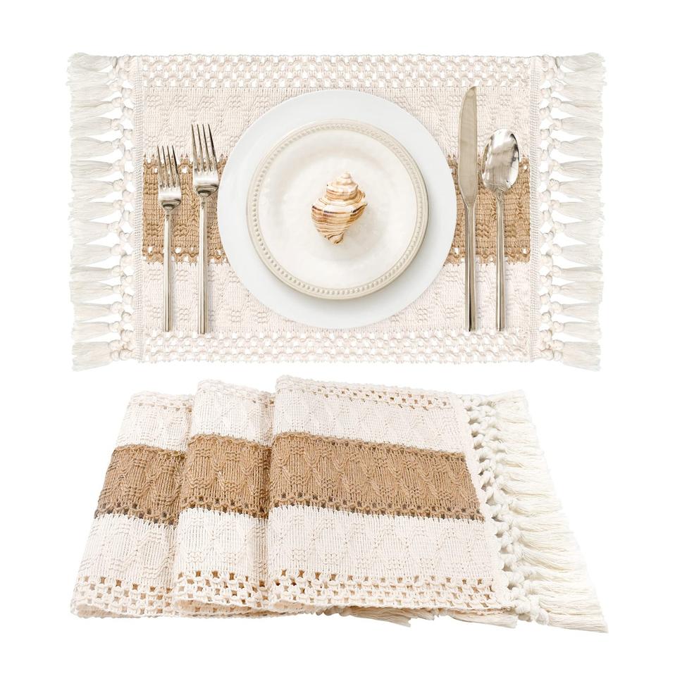 แผ่นรองจานแมคคราเม่แบบมีสไตล์แผ่นรองจานสีแบบโบราณตกแต่งตามธรรมชาติคุณภาพสูงปรับแต่งได้