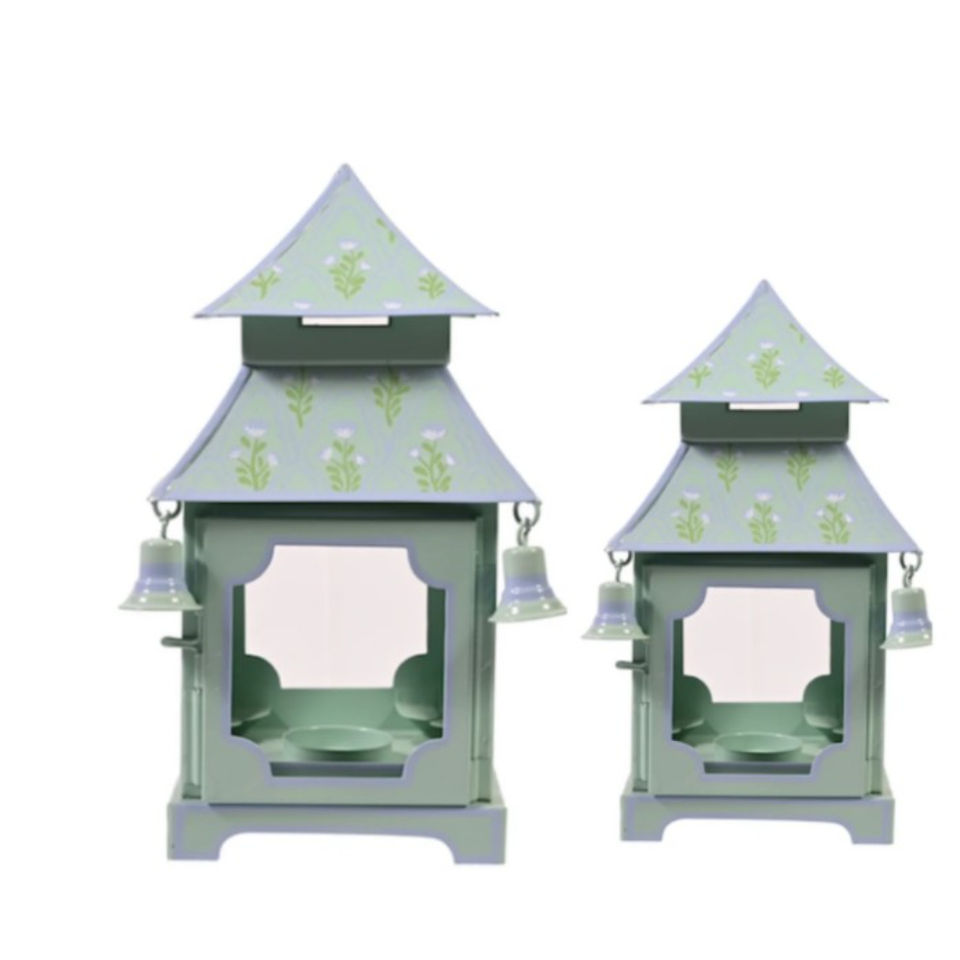 ชุดโคมไฟทรงเจดีย์สีเขียวเซจและทิวลิป ดีไซน์ทันสมัย 2 ชิ้น ทำจากโลหะเพ้นท์มือ พร้อมกระดิ่ง สำหรับตกแต่งบ้าน