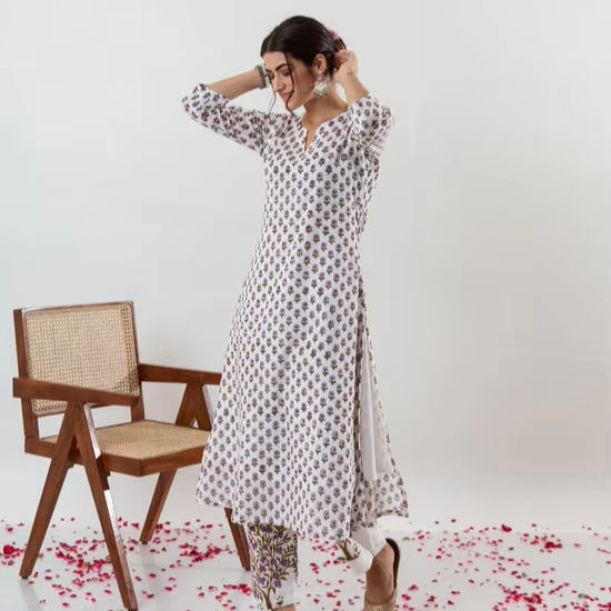ชุดออกแบบอย่างมีสไตล์ผ้าฝ้ายพิมพ์ลายแขนกุดคอวีใส่สบายตกแต่งด้วยกระดุมที่ทำด้วยมือและมีเอกลักษณ์
