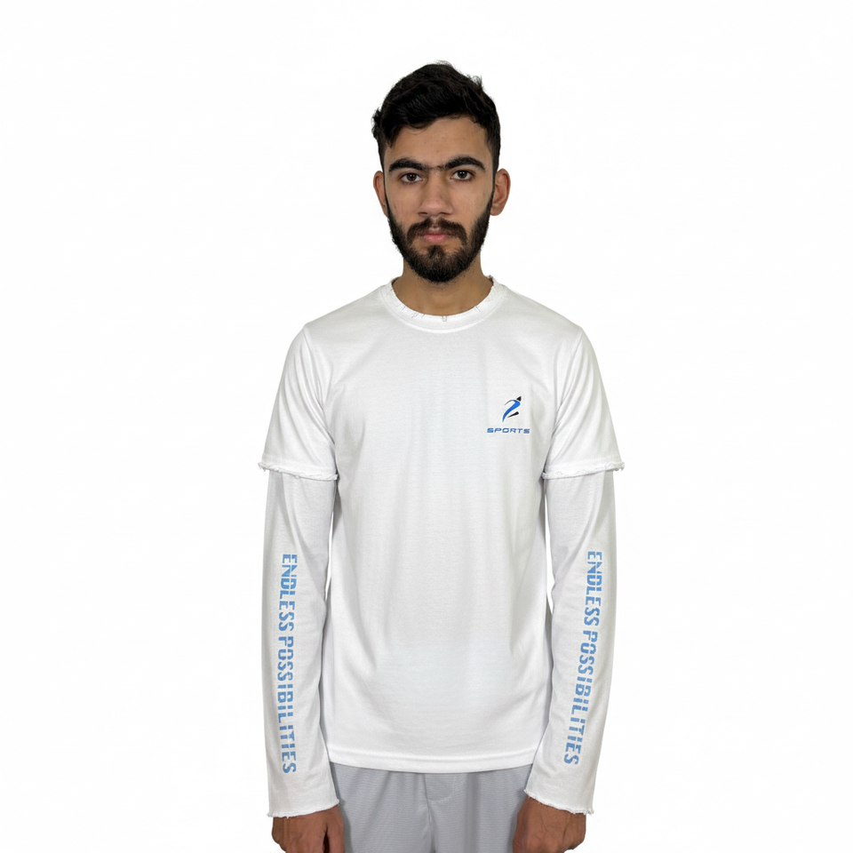 เสื้อยืดสองชั้นสุดเท่พร้อมแขนเสื้อสีตัดกันสำหรับผู้ชาย แฟชั่นทันสมัยและสวมใส่สบาย เสื้อยืดสองชั้น