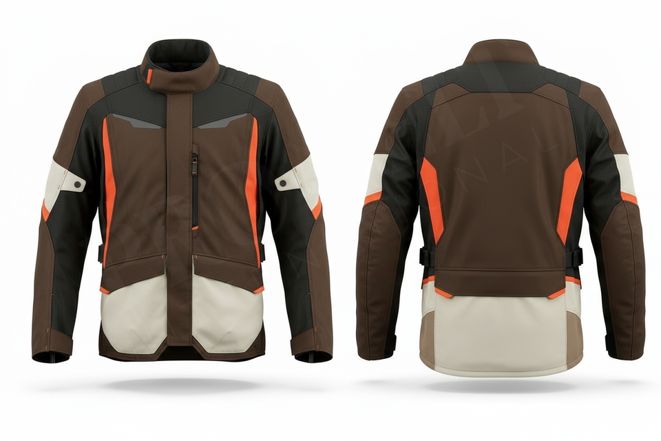 แจ็คเก็ตมอเตอร์ไซค์สีน้ำตาลเรียบหรู ทนทาน กันน้ำ ระบายอากาศได้ดี พร้อมอุปกรณ์ป้องกันอย่างดี