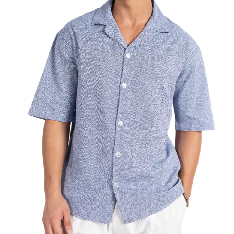 เสื้อเชิ้ตผู้ชายลำลองผ้าฝ้ายย้อมเส้นด้าย ระบายอากาศได้ดี เป็นมิตรกับสิ่งแวดล้อม ทรงโอเวอร์ไซส์ คอปก ทรงบ็อกซ์ ไหล่ตก ดีไซน์ทันสมัย เหมาะสำหรับฤดูร้อน