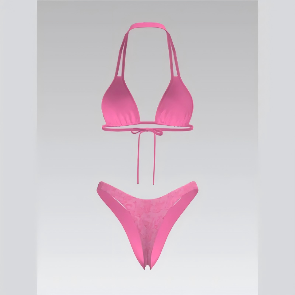 ชุดว่ายน้ำทูพีซแบบผูกหลัง ดีไซน์เก๋ไก๋ คอ halter ปักลายสวยงาม ช่วยเสริมทรง พร้อมดีเทลผ่าข้าง เหมาะสำหรับใส่ไปเที่ยวชายหาดหรือรีสอร์ท
