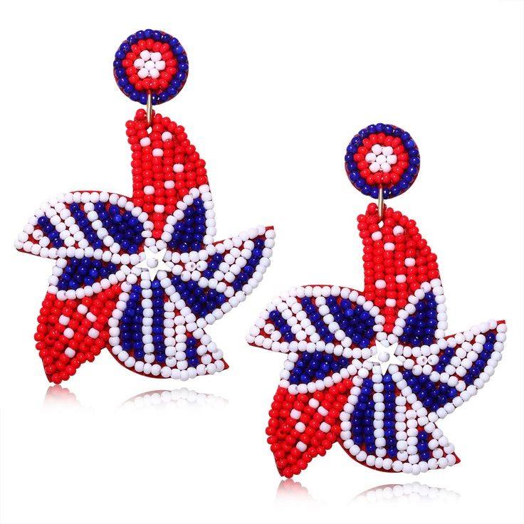 ต่างหูลูกปัดรูปธงชาติอเมริกันสีแดงสีขาวและสีฟ้ามีสไตล์หรูหรามีสไตล์ทำมือปักลายดาวประดับมุกลูกปัดเพชรอินเดีย