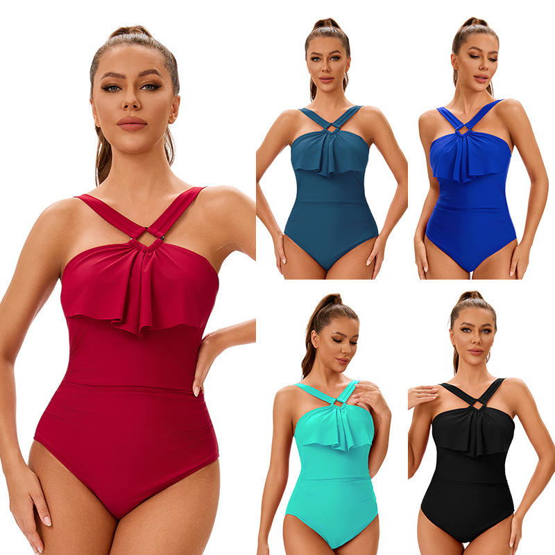 ชุดว่ายน้ำฟิตเนสไซส์ใหญ่พิเศษของผู้หญิงสไตล์ยุโรปชุดชายหาดชิ้นเดียวชุดเข้ารูปสีพื้นหลังเซ็กซี่
