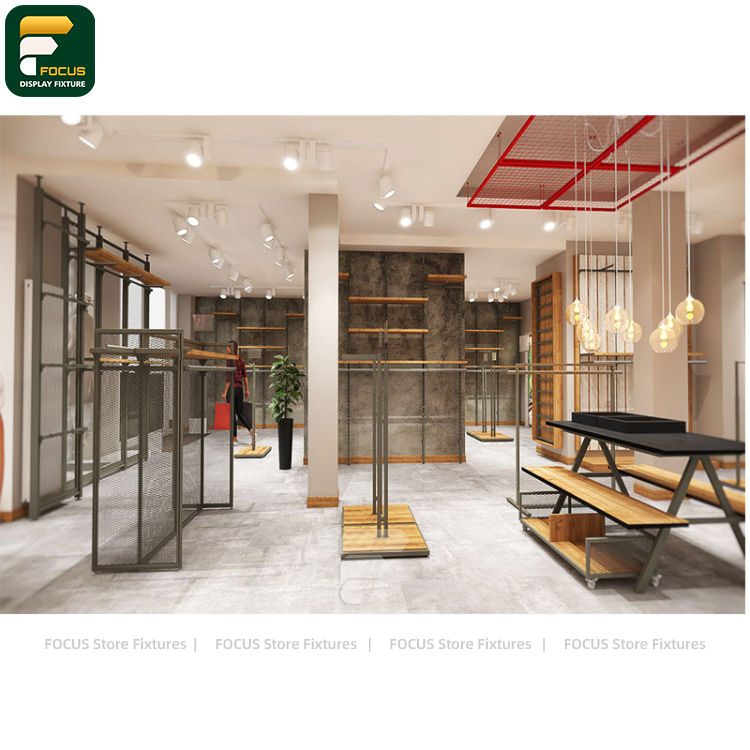 ชั้นวางโชว์เสื้อผ้าแฟชั่นทันสมัย พร้อมแผงผ้าเนื้อนุ่มสำหรับแขวนเสื้อผ้า