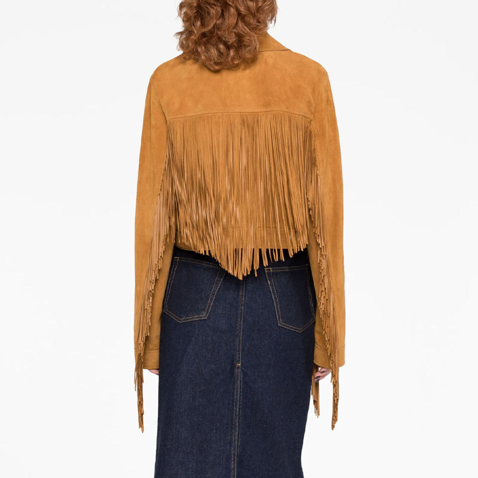 แจ็คเก็ตหนังกลับแต่งพู่มีสไตล์แฟชั่นหรูหราหรูหรา