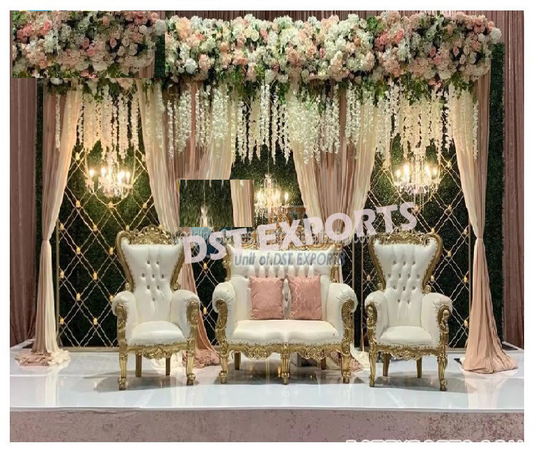 ชุดโซฟาสีทองมีสไตล์สำหรับงานแต่งงานมุสลิมวัสดุไม้สักการออกแบบอย่างมืออาชีพสำหรับการตกแต่งเวที