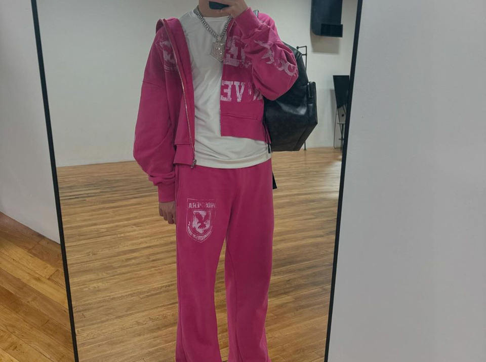 ชุดเสื้อมีฮู้ดและกางเกงวอร์มสีชมพูจากสมาคมกรีกมีสไตล์เพื่อความสบายสูงสุดและทันสมัยในวิทยาลัย