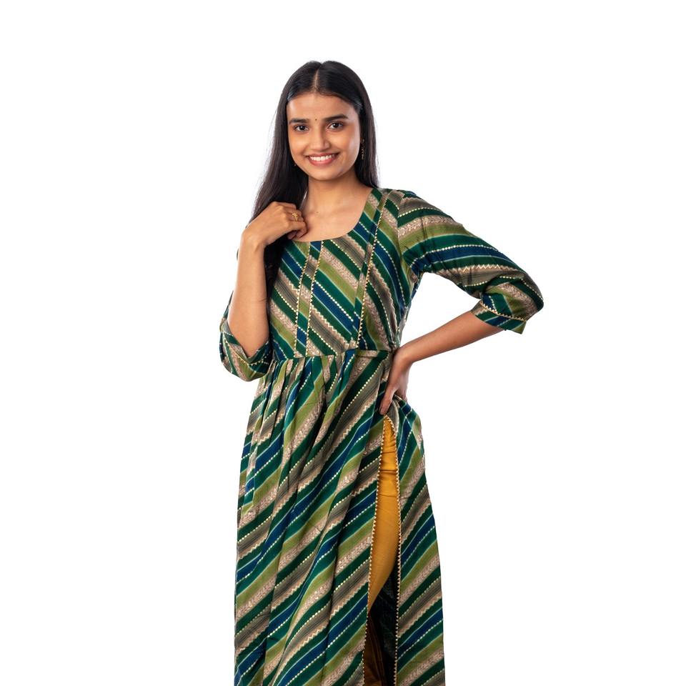 ชื่อผลิตภัณฑ์:สีเขียว manderi Modal kurta ยาว