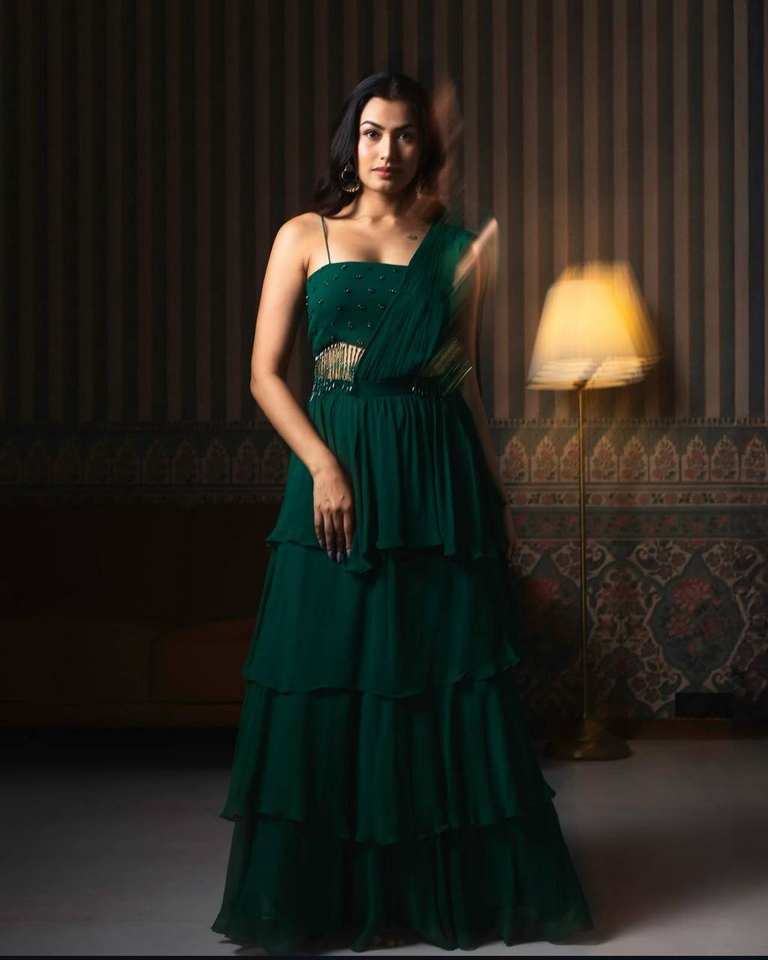 Lehenga choli สีเขียวมีสไตล์พร้อมด้วยงานฝีมือของผู้หญิงอินเดียและปากีสถานสำหรับงานแต่งงานและงานปาร์ตี้