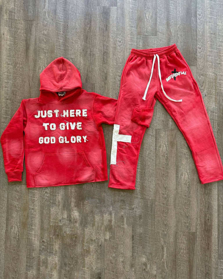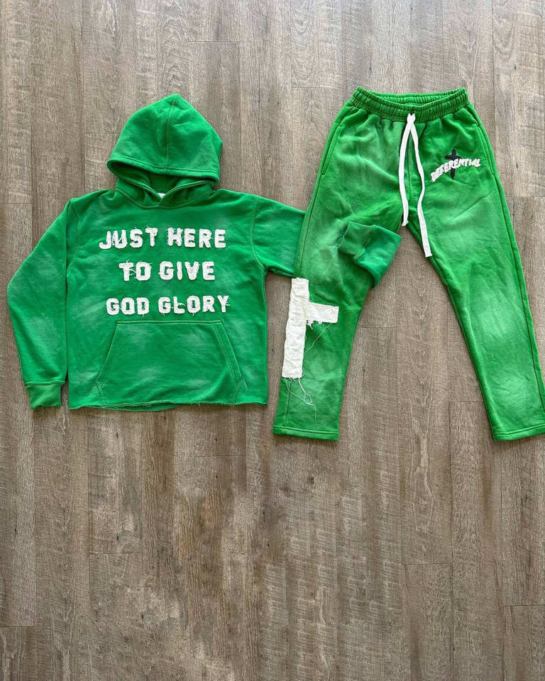 ชุดฮู้ดดี้และกางเกงจ็อกเกอร์สีเขียวสุดเท่ห์ สไตล์ชมรมนักศึกษากรีก ชุดลำลองแนวสตรีทแวร์ที่สะท้อนความเชื่อ พร้อมดีไซน์ลายกางเขนและข้อความสร้างแรงบันดาลใจ