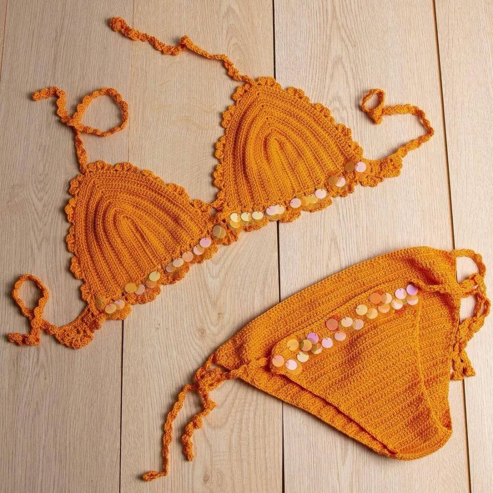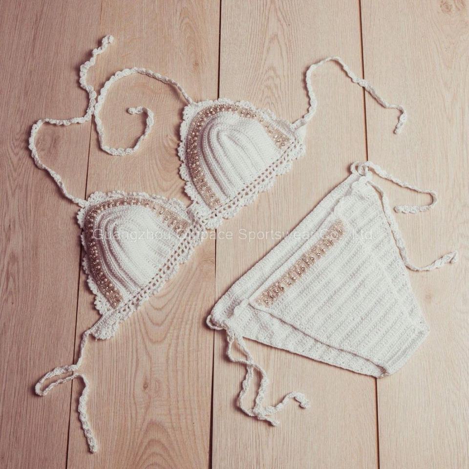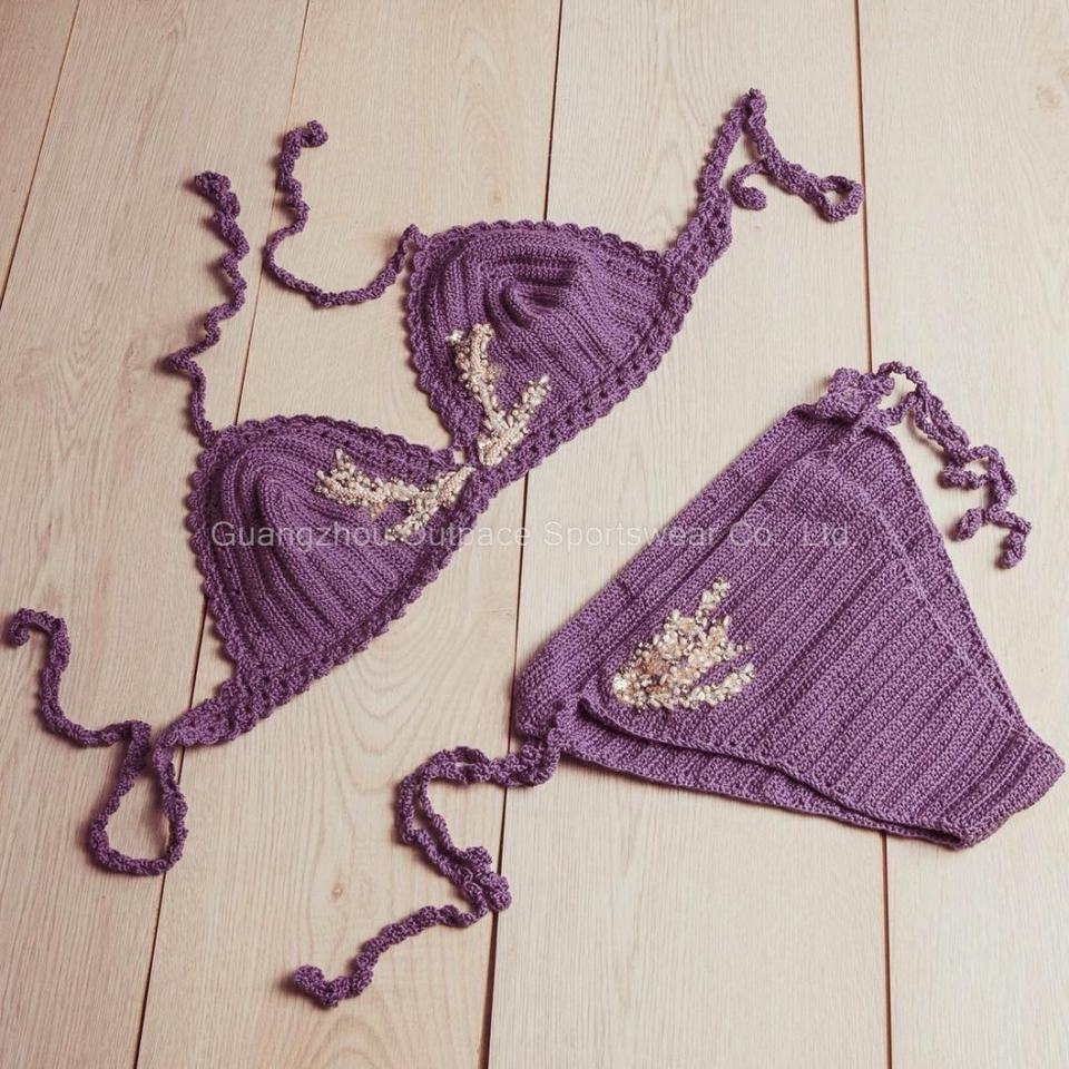 ชุดบิกินี่โครเชต์ทำมือสุดเก๋ 2 ชิ้น ชุดว่ายน้ำผู้หญิง พร้อมงานปักมือด้วยเชือกและตกแต่งดอกไม้ 3 มิติ