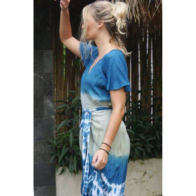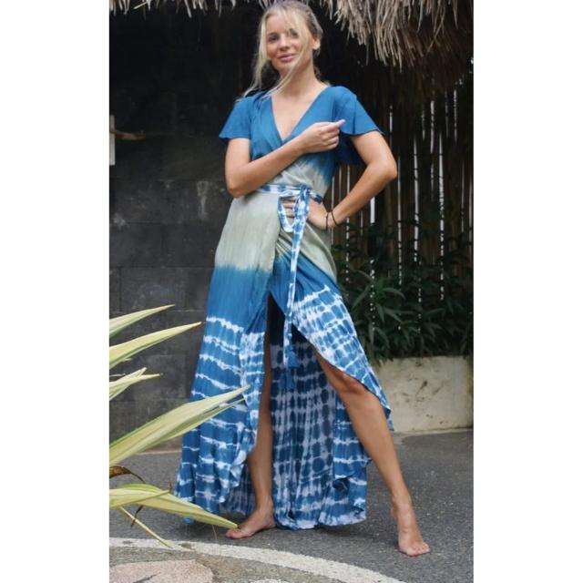 เดรสยาวผูกเอวสไตล์ลำลองสำหรับฤดูร้อน ทำมือ ลายมัดย้อม ทรงหลวม ใส่สบาย แขนสั้น ดีไซน์ผูกหลัง
