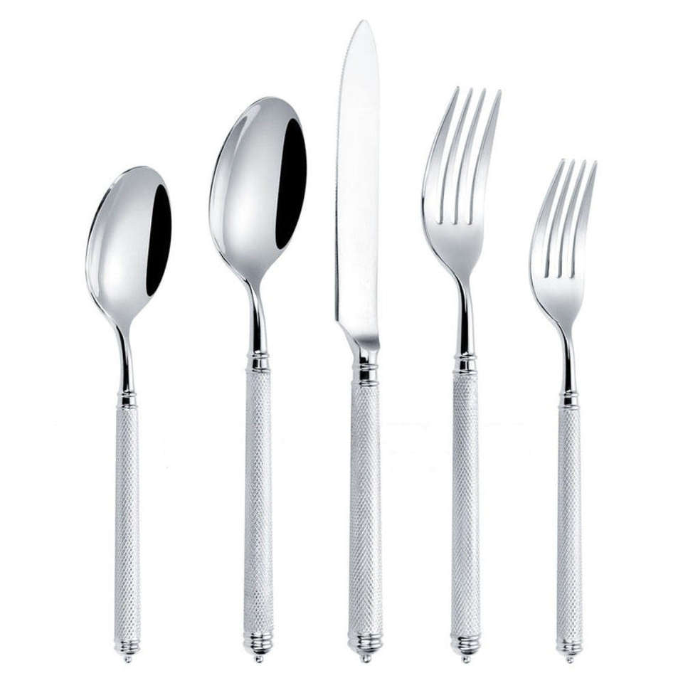 ชุดเครื่องใช้บนโต๊ะอาหารสเตนเลสสตีลคุณภาพสูง5ชิ้นสไตล์อเมริกันพร้อมชุดช้อนส้อมชุบทองด้ามสีขาว