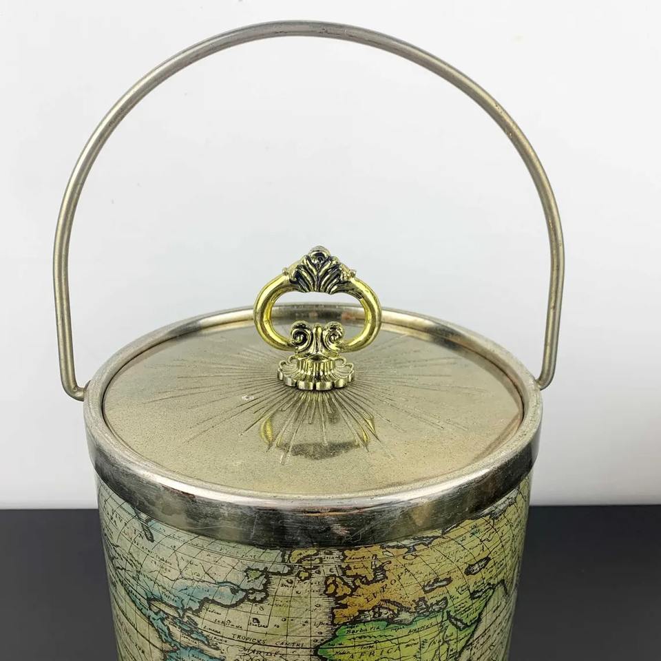 ถังน้ำแข็งมีสไตล์ลายแผนที่โลกพร้อมฝาปิดและที่จับกลมเหมาะสำหรับวางบนโต๊ะไวน์เพื่อความบันเทิงในบ้านจากอินเดีย
