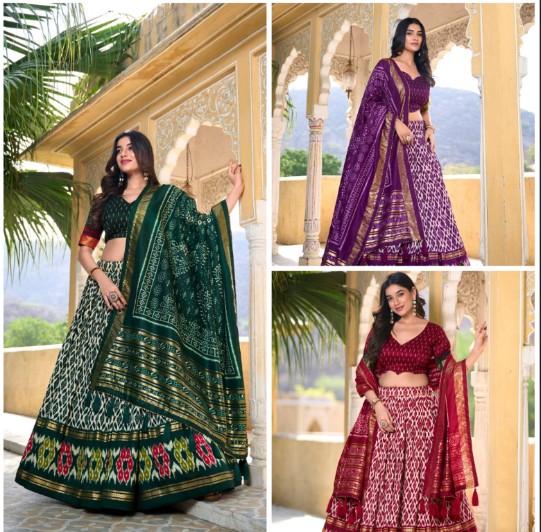 Stylish Ikkat Print Tussar Silk Lehenga Choli Set with Foil Work Gotta Patti Dupatta and Can Can Stitching for Wedding Wear